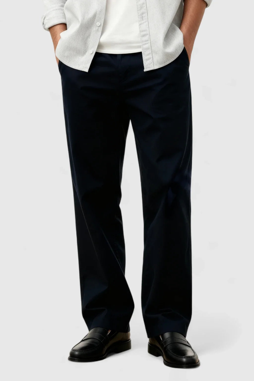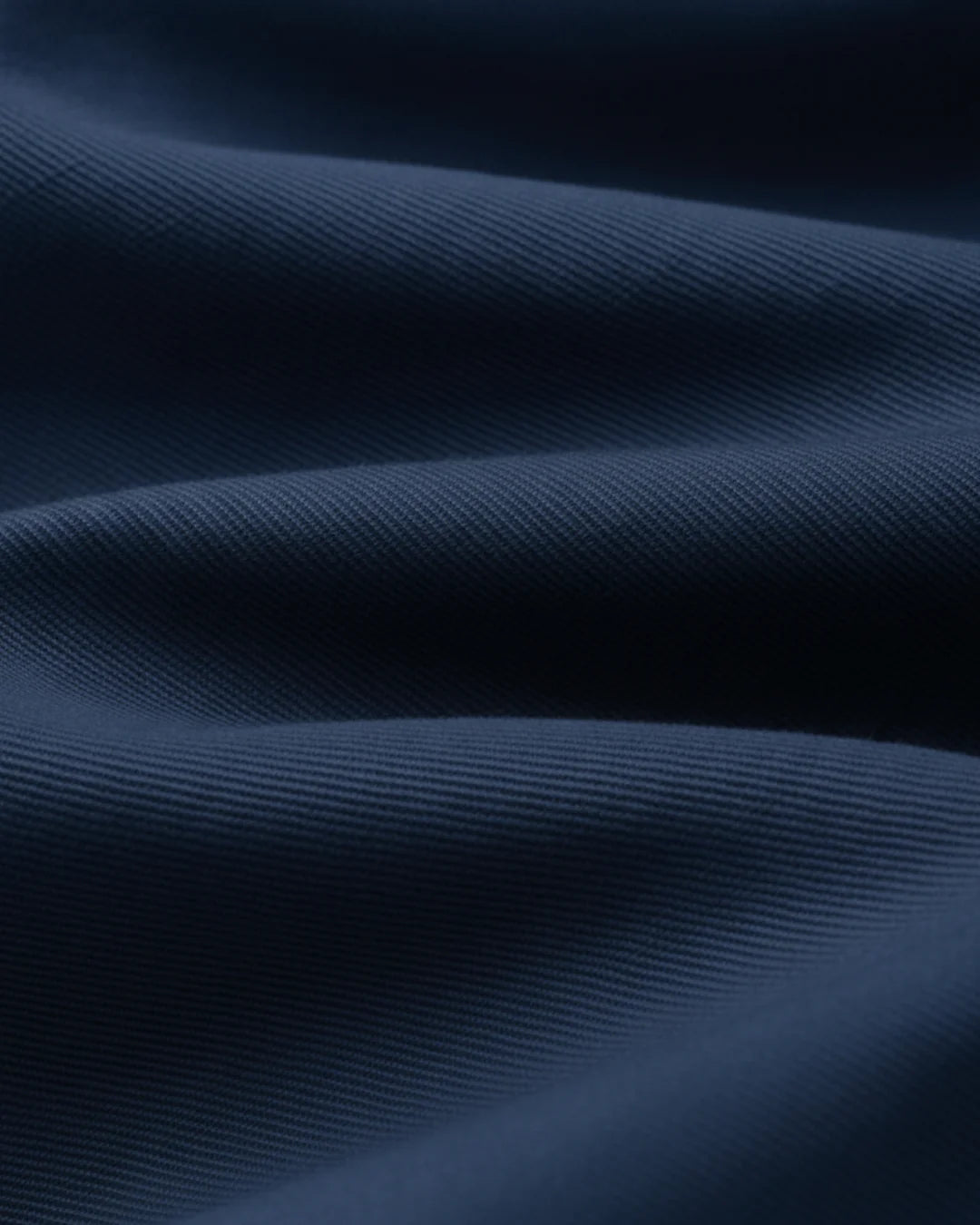Designet til den moderne, kreative mand kombinerer disse navyblå chinos holdbarhed og komfort gennem et 270 gsm bomuld/hør twillstof, som falder naturligt men bevarer sin struktur.