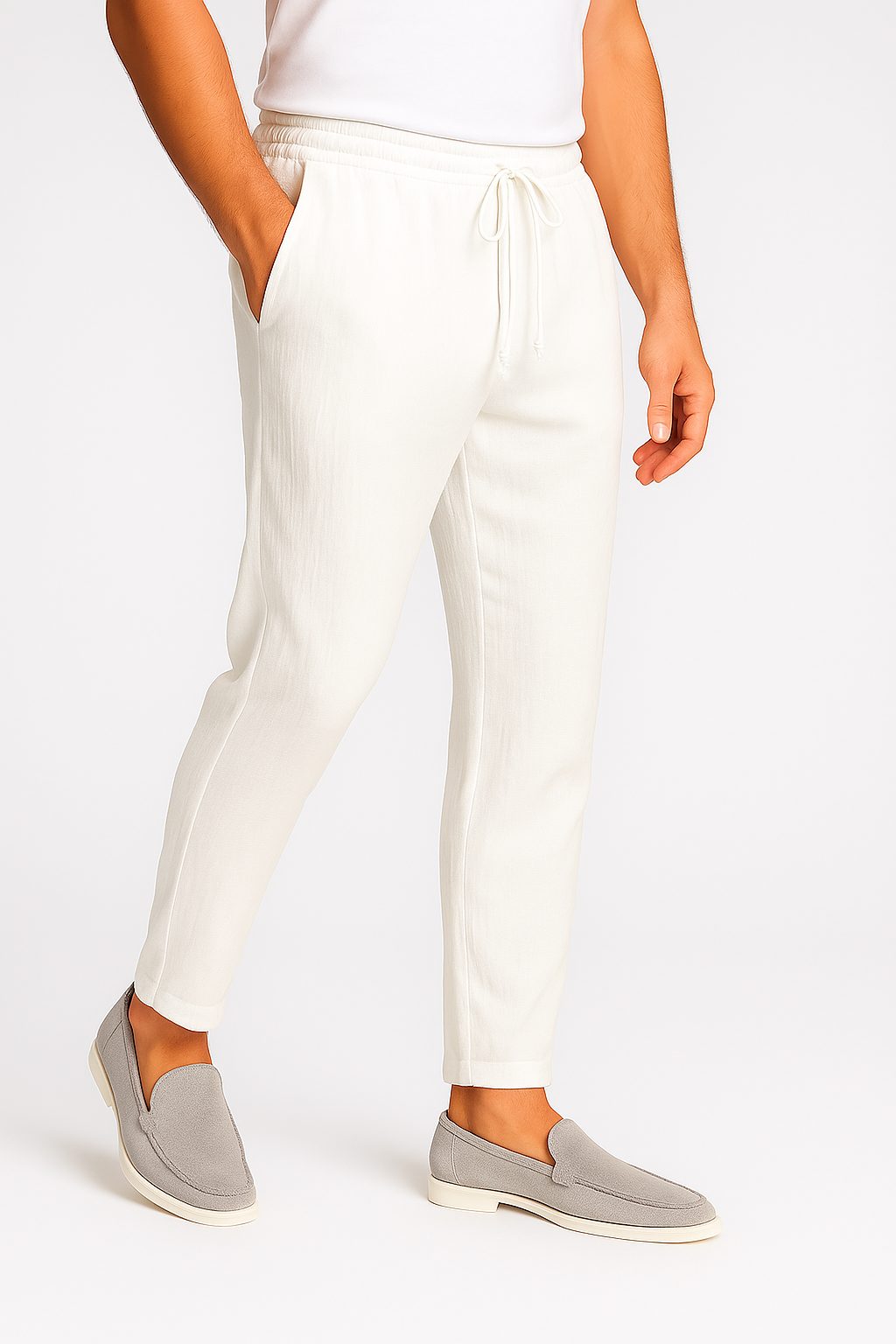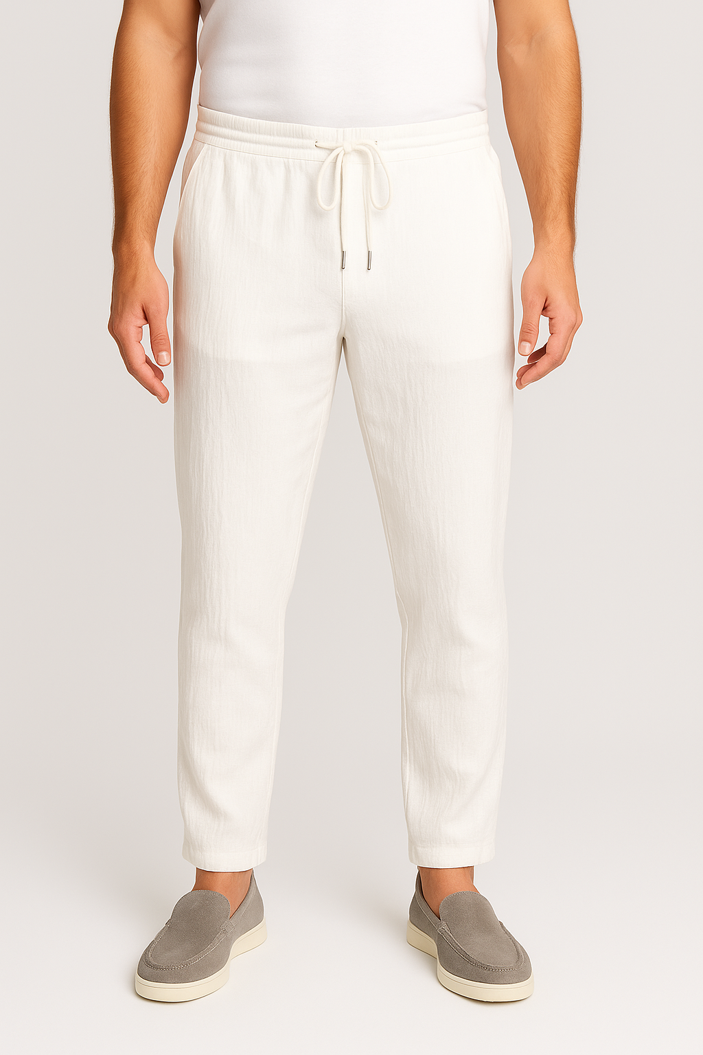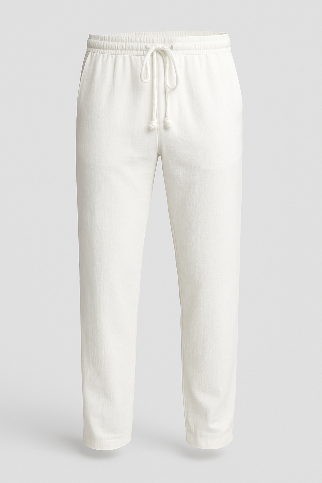 Disse casual herrebukser med snøre er perfekte til daglig brug. Fremstillet af 100% vævet bomuld uden stræk, tilbyder de både komfort og et rent, afslappet look. Med elastisk talje, justerbar snøre og lige ben er de ideelle til forårs- og efterårsvejret. Praktiske lommer og et minimalistisk design gør dem til et alsidigt valg i garderoben.
